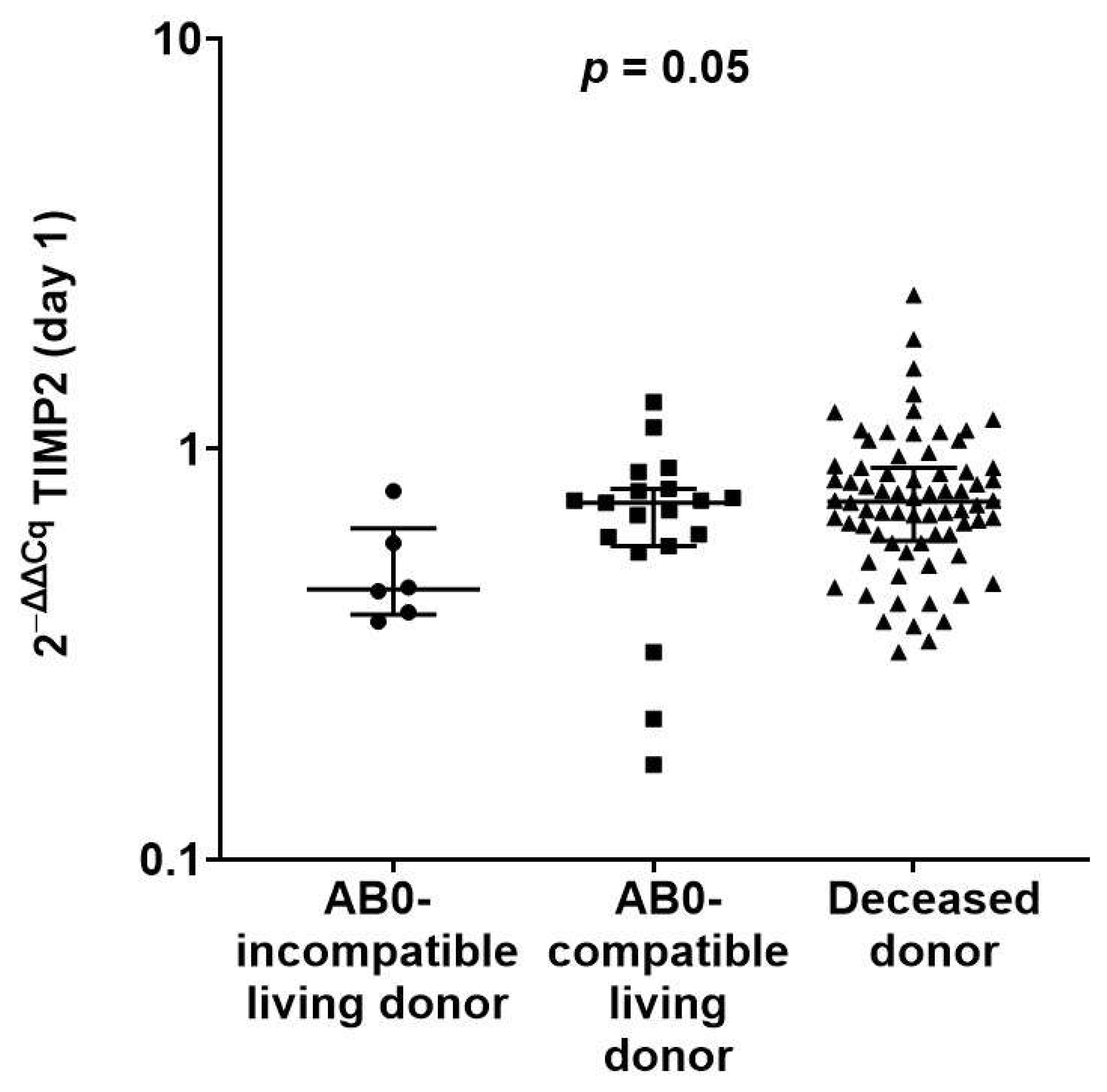 3.2. Postoperative TIMP2 Transcripts According to Donor Type