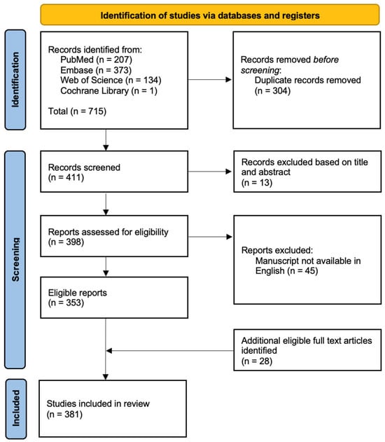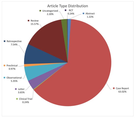 The search yielded a total of 715 results across all four databases: 207 from PubMed, 373 from Embase, 134 from Web of Science, and just one from Cochrane Library. When duplicates were removed there were 411 unique articles to review. Categorical distribution of the results can be seen in Figure 2.