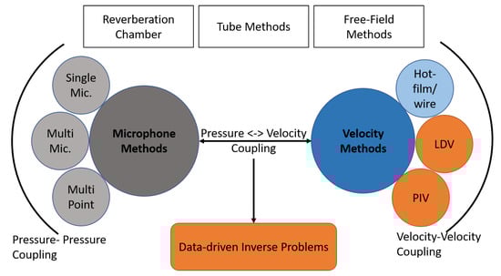 Figure 1 shows an overview of the existing techniques used across various domains. Primarily, the measurement techniques can be classified into pressure based and velocity based methods. The pressure-pressure coupling through single/multi microphones and multi-point microphones have been in practice over several decades. On the other hand, velocity-velocity coupling is fairly new, especially in the case of two-dimensional velocity fields from particle image velocimetry (PIV) and high temporal resolution Laser Doppler Velocimetry (LDV). In either of the two cases, a plane wave assumption must be imposed or respected in arriving at impedance. Similarly, pressure to velocity coupling or inverse coupling through modeling (Euler momentum equations) are devoid of any assumptions related to the nature of wave. The inverse coupling using PIV is one of the less explored topics and it could lead to successful determination of spatially and temporally resolved impedance characterization. Among all these methods, the fundamental distinguishing factor is the type of instrumentation/probing device used. Looking at the current trends in the machine learning and data-driven approaches to engineering problems, the future prospects might have a greater influence on acoustic impedance measurements. Based on the limited measurement data sets using limited instrumentation, a data-driven inverse problem approach could pave way to better modelling of pressure-velocity (and inverse) coupling. Data-driven methods involving supervised machine learning techniques and neural network are being used for seismic studies [8,9,10] and show promising research avenues. Based on the published literature, the current focus is on understanding the rock properties based on the acoustic sampling through impedance measurements. Such inverse coupling methods using data to physical/semi-empirical model approach could be generalised for other materials and applications.