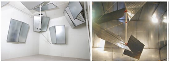 Just the sufficient size of the chamber and non-parallel walls do not ensure perfect sound diffusion, hence, separate devices or objects are used for randomizing the sound waves further. Schultz [22] define sound diffusion, reasons why it is important, describe how the degree of diffusion can be evaluated, and give ways by which diffusion can be achieved. Some common ways of achieving sound diffusion are static suspended diffusers, stirrers, and rigid diffusers on the wall. Each of these sound diffusing methods have benefits and limitations. Means of diffusion cause some loss in reverberation time due to absorption by the devices themselves, and hence their use is limited. In the case of stirrers, the induced currents [23] and their frequency dependency plays an important role, and such effects have been studied as a radiative problem [24]. Similarly, the effect of diffusers and their optimal diffusion conditions have been studied by Kim et al. [25]. Duanqi et al. [26] placed reinforced concrete spherical diffusers of different sizes on the walls as seen in Figure 2 to ensure diffusion without causing significant reduction in reverberation time. Figure 3 shows a typical stationary suspended diffuser and a stirrer in a reverberation chamber. Hengyi et al. [27], Wanderliner et al. [28], and Zhao et al. [29] have shown an innovative method with complete departure from mechanical stirrers. They show the application of meta material coating with a random 1-bit rotating meta surface. This method has shown credible results when compared to the conventional mechanical reverberation chambers.