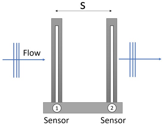 The Microflown (p-u probe) is a unique acoustic sensor which directly measures the particle velocity instead of the sound pressure. The working principle of the Microflown is similar to a hot-wire anemometer. While a typical anemometer uses heated, extremely thin wire, the Microflown uses two thin wires [51]. The Microflown’s measurements are based on the temperature difference between the two, thin, resistive wires which are few m apart. A diagram of this setup is shown in Figure 5. A travelling acoustic wave is accompanied by movement of air. This movement of air and its interaction with the Microflown leads to heat being convected from the first wire to the second. The difference in temperature results in a difference in electrical resistance which can be measured. The difference in resistance provides a broadband linear signal that is proportional to the particle velocity up to sound levels of 135 dB. In order to insure temperatures are high enough to get a measurable temperature difference, a DC current is used to keep the operating temperature of the two wires at 400–600 K. A typical experimental setup is shown in Figure 6.