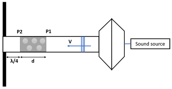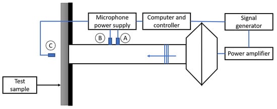 The experimental apparatus consists of a hollow tube, typically cylindrical, with a test sample holder at one end and a sound source at the other. The sound source is connected to an amplifier which is connected to a waveform generator that generates the broadband noise. Microphone ports are flush mounted at two locations along the wall of the tube. A sample schematic of the impedance tube setup is shown in Figure 4 below. It must be noted that the tube methods have been refined over the past several decades and the schematic shown here is a very generic setup. The most recent designs in compliance with ISO standards can be referred to the works [45,46]. The work by Niresh et al. [47] provides insights into recent developments on error corrections.
