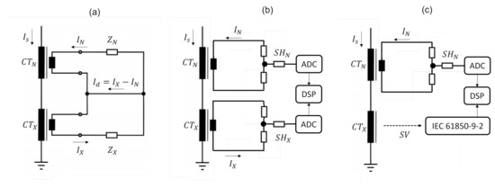 Typical configuration of a measuring bridge based on: difference method (a), digital signal processing (b), and IEC 61850-9-2 protocol (c).
