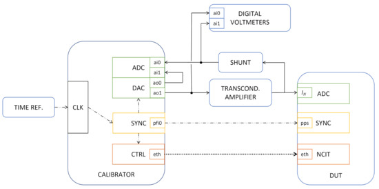 As shown in Figure 2, the setup consists of six main components: a time reference, a calibrator, a transconductance amplifier, a calibrated shunt, a set of synchronized voltmeters, and the Device Under Test (DUT), i.e., the measuring bridge.