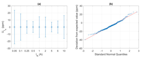 Uncertainty of the current amplitude at the output of the DAQ module as function of the selected current level (a). Quantile-quantile plot relative to a current level of 5 A (b).