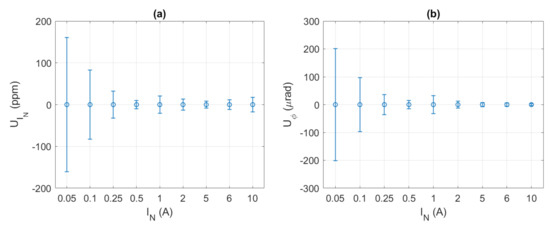 Once output by the calibrator, the transconductance amplifier converts the voltage test waveform in the corresponding current waveform. In order to characterize the amplitude and phase contributions of this stage, this signal is re-acquired through a high-accuracy current shunt. It is worth noticing that the shunts (periodically calibrated) contribute to the overall uncertainty by at most 0.90 ppm for the amplitude, and 1.50 rad for the phase [29,30]. On the other hand, the transconductance amplifier has a much more significant impact on the overall uncertainty. As per the calibrator output, we analysed the amplifier output via the DVM. In this case, we were also able to compute the phase displacement between the two channels, i.e., the phase displacement introduced by the transconductance amplifier (and the shunt). For each considered current level, we carried out 200 independent measurements and computed the corresponding statistical distributions: the mean value is taken as a systematic contribution and thus compensated, the standard deviation is used for the uncertainty computation. Figure 4 presents the uncertainty associated with amplitude and phase as function of the current level. In the worst-case, the former is equal to 160.75 ppm, whereas the latter is 200 rad. In this regard, it is worth noticing how the uncertainty rapidly increases when the current levels fall below 500 mA. Indeed, the selected amplifier is designed for high current output and exhibits a poor accuracy at lower current levels. At the nominal value of 5 A, the uncertainty for amplitude and phase are just 8.36 ppm and 8 rad, respectively.