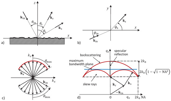 In order to quantify these effects, we briefly summarize the Kirchhoff formulation of [11,15,17] with respect to the scattering geometry of a microscope in reflection mode as already published in our previous paper [6]. For simplicity, we assume a perfectly reflecting surface and a monochromatic plane wave of wavelength and wavenumber . According to Figure 1a, is the angle of incidence with respect to the z-axis and the angle, the -component of the incident wave vector includes with the x-axis (see Figure 1b). For an incident plane wave characterized by and , the normalized scattered far-field under the azimuthal angle and the scattering angle according to Figure 1a,b results from the integration:
