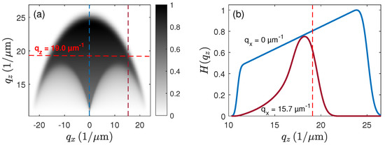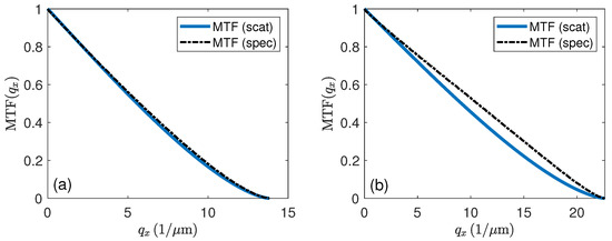 On the other hand, the irradiance of reflected light incident on a perfect mirror under an angle must be the same whether the mirror is perfectly aligned in the -plane or if it is tilted by an angle such that the plane wave is incident normal to the surface. This is achieved by (14), which no longer depends on the coordinate. The 3D TF discussed so far holds for conventional microscopes. Therefore, it should be mentioned that, due to the symmetry of the arrangement according to Figure 2a,b and the uniform pupil illumination, it equals the 3D TF of an interference microscope [6,19]. As a consequence of the different 3D TFs shown in Figure 3 and Figure 4, the MTFs also resulting from -integration will be different as Figure 5 confirms. For the point scatterer, the MTF exactly agrees with the MTF of a diffraction limited system [19], whereas in the specular case at high NA values, the resulting MTF comes closer to a linear function (see Figure 5b). Additionally, note that the plateau of for enables the perfect reconstruction of the weak phase grating as long as