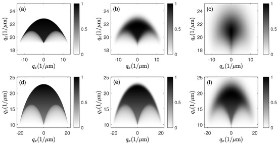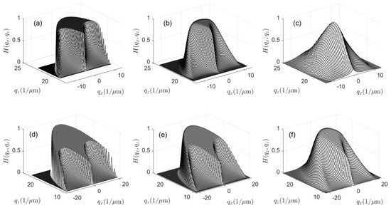3D representations of cross sections of the transfer functions according to Figure 6: (a–c) for , nm and spectral FWHM of 2.5 nm (a); 25 nm (b); and 100 nm (c); (d–f) for , nm and spectral FWHM of 2.5 nm (d); 25 nm (e); and 100 nm (f).