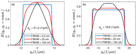 Cross sectional views of the transfer functions for different spectral bandwidth given by the FWHM, (a) for , nm, and , (b) for , nm, and .
