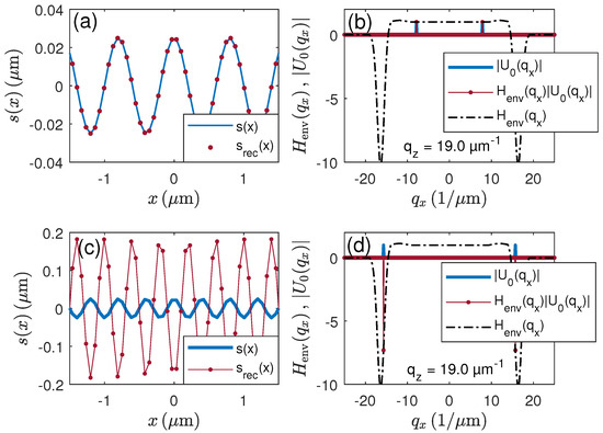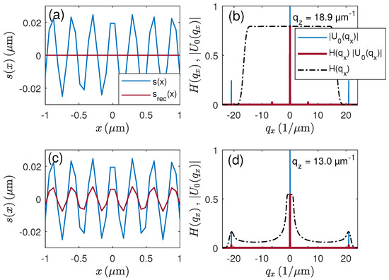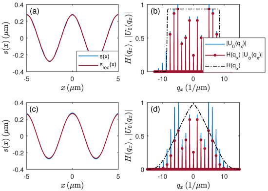 In Figure 12, an input profile with 50 nm PV-amplitude and 0.3 µm period length is presumed. This period is close to the resolution limit of 0.28 µm for NA = 0.9 and nm. According to Figure 12a for µ, the first order diffraction component is cut by the corresponding partial TF in Figure 12b, such that the cosinusoidal structure does not appear in the reconstructed profile. However, if is reduced to 13.0 µ (Figure 12c,d), the bandwidth of the partial TF increases and the cosinusoidal structure is resolved, although the PV-amplitude is reduced approximately by a factor of 3. This is in accordance with our experimental results published earlier [6,29].