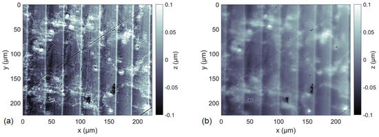 As a final example, Figure 15 shows the measured topography of a diamond milled aluminum mirror as a real-world object. The comparison of the results of envelope analysis in Figure 15a and phase analysis in (b) exhibits that the envelope result is characterized by high-frequency components, whereas the result of phase evaluation appears to be low-pass filtered. We suppose that this is a consequence of the high spatial frequency enhancement introduced in Figure 13 and Figure 14. However, since the NA is 0.55 in Figure 15, the bandwidth for high-frequency enhancement is even broader in this case. In both cases, the sawtooth-like grooves of approximately 50 nm depth originating from the manufacturing process can be recognized. Although the theoretical derivation of the 3D TF reported in Section 2.1 neglects the central obscuration due to the reference mirror in a Mirau interferometer, the results according to Figure 15 confirm the basic effect of different spatial frequency transfer characteristics depending on whether the coherence or the phase profile is analyzed.