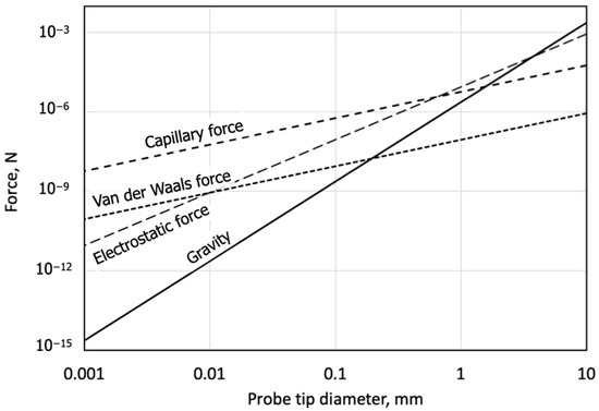 Surface forces vary significantly depending on the material, surface properties, and environment. Figure 2 shows the surface forces working on the microprobe tip. The surface forces become increasingly more prominent than gravity when the size of the microprobe tip is less than a few millimeters. Surface forces are several orders of magnitude greater than gravity at scales of several tens to several hundred micrometers in diameter [31,32,33,34]. Therefore, surface forces attract the probe tip to the surface when the probe tip is close to the measurement surface [35]. Although surface forces can be reduced via chemical treatment, surface texture, and environmental control [32,33], it is difficult to ignore the effect of these surface forces in micro-CMM probes. Surface forces significantly degrade measurement repeatability and reproducibility. Moreover, these surface forces cause probe tips to stick to the measurement surface and vibrate. The smaller the probe diameter, the more remarkable these effects become. In certain cases, increasing the probe stiffness solves the problem; moreover, another approach to avoid the sticking problem is to use non-contact or semi-contact detection. Furthermore, when the probe tip comes into contact with the measurement surface, the strong adhesion forces can induce contamination on the probe tip and measurement surface [36]. Moreover, there is a technique of scanning measurement using this probe tip sticking. The probe tip and measurement surface are in contact using a flexible probe system with low stiffness, such as optical fiber, and the probe tip is scanned over the measurement surface [37].