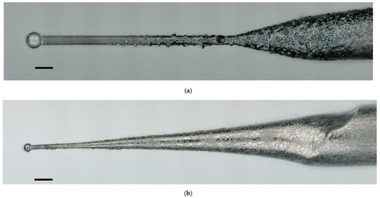 Images of microprobe tip fabricated by wire-electro-discharge grinding (WEDG) [50]. The black bar indicates 100 μm: (a) Glass tip attached at the end of the shaft. The diameter of the tip was 70 μm; (b) Tungsten carbide tip. The diameter of the tip was 59 μm.