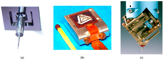 Microprobe system development began in the early years at NMIs and universities in Europe and the United States, as well as Japan [11,47,59,63,64,65,66,67,68,69], where many types of probe systems were developed. In particular, there have been developments of microprobe systems with relatively large probe tip sizes and high sensitivity, in which a hinge structure is used to detect the contact between the probe tip and measurement surface [59,63,64,67]. Figure 4 shows certain examples of hinge-typed microprobe systems. The primary point of this probe type is to measure the deformation of the hinge with high sensitivity; therefore, multiple methods, such as optical measurement [60], capacitive sensors [22,60], and silicon membrane sensors [64] have been proposed. This hinge-type probe system has been proposed and developed [70,71,72,73,74,75,76,77,78,79,80,81,82,83,84,85,86], and certain commercially available microprobe systems of this type are available [87,88,89,90,91,92]. By designing structures and materials, hinge-type probe systems can control the stiffness of the probing system. Therefore, the high detection sensitivity could be designed, and multiple probes have achieved resolutions of several nanometers [59,93,94,95]. Furthermore, hinge-type microprobe systems can be designed to be compact to reduce the dynamic mass [96]. The disadvantage is that the microprobe system is increasingly challenging to assemble compared with other types of probes introduced below; moreover, the pre-travel is typically limited, thus increasing concerns about damage to the microprobe system. Therefore, probes that are easy to replace are expected [96]. Probes that incorporate piezoelectric actuators in the hinge to make the probe tip actively vibrate by stretching and contracting is an interesting example of a hinge-type probe [97,98]. There is a probe that can change the stiffness of the hinge structure [99]. The low measurement force and 3D isotropy of sensing could be achieved by designing an intelligent hinge structure [59,96]. Furthermore, using MEMS, a probe system that can be oscillated in three axes and incorporates a three-axis electrostatic actuator has been proposed [100]. Thus, the hinge-typed microprobe system can perform various functions by combining MEMS and semiconductor technologies and developing a hinge mechanism.