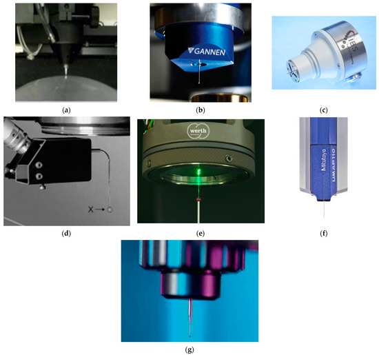 Commercialized microprobe systems: (a) Panasonic, UA3P AFP [114]; (b) Xpress PE, GANNEN XP [87]; (c) IBS P.E. Trislelion [89]; (d) Werth Fiber Probe, WFP/S, reprinted with permission from ref. [110]. Copyright 2012 Elsevier, License Number: 5158821452309; (e) 3D Werth Fiber Probe [107]; (f) Mitutoyo, UMAP; and (g) Zeiss, F25 probe, reprinted with permission from ref. [90]. Copyright 2012 Elsevier, License Number: 5158830075542.