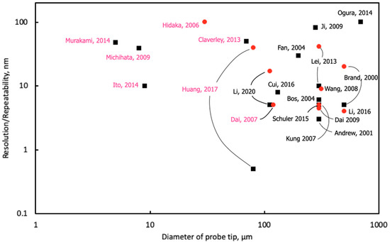 Many probes have been proposed to date. This section provides an overview of microprobe systems based on their specifications. As previously reported, there is a close relationship between probe tip size and performance. Therefore, the discussion was developed based on the probe tip size. Figure 7 shows the relationship between the probe tip size and resolution or repeatability of researchers’ proposed microprobe systems. The black squares and red circular plots show the resolution and repeatability of the microprobe system, respectively. The plots are denoted name and year. Those with black and red font show the contact-type and physical interaction probes. The evaluation criteria differ among studies; thus, the purpose of Figure 7 is not to rank the performance of microprobe systems, but to overlook the trend based on the probe tip size and probing principle.