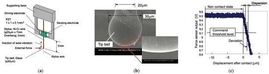 Figure 8 shows the UMAP developed by Mitutoyo [69]. A pioneering vibration probe, Mitutoyo’s probe has a small diameter. A glass sphere with a diameter of 30 μm was attached to the tip of a shaft with a diameter of 20 μm. The aspect ratio with a 3 mm shaft is 100. A piezoelectric actuator causes oscillation on the probe shaft in the axial direction (Z-direction); furthermore, the probe oscillation is measured by the piezoelectric element. The resonant frequency is 349 kHz, and the measurement is based on the amplitude decay when vibrating at the resonant frequency. The vibration attenuation caused by interactions with the measurement surface is determined (Figure 8c), and the measurement surface is detected by setting a threshold on the attenuation amount. The measurement force was evaluated to be significantly low, i.e., 0.15 μN. UMAP has been commercialized, as shown in Figure 6f. According to Mitutoyo’s website, it is available in diameters ranging from 15 to 300 μm with a high aspect ratio.