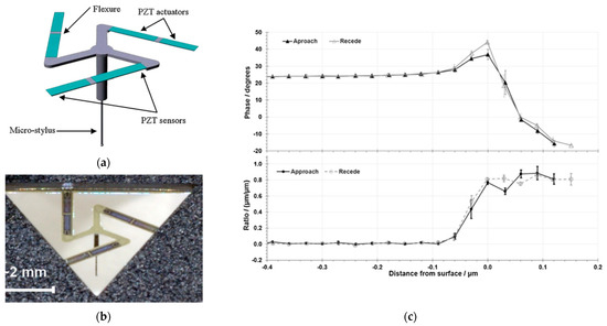 A vibration probe with an active hinge structure was proposed. To avoid anisotropic sensitivities during measurement, the probe tip is vibrated perpendicular to the measurement surface [31,97]. A piezomaterial is deposited in the hinge structure and used as an actuator and a sensor for the expansion and contraction of the hinge using MEMS (Figure 10a,b). A tungsten carbide spherical tip stylus shaft with a diameter of 50 μm is bonded to the center of the hinge structure. Wire electro-discharge grinding (WEDG) was used to develop the thin shaft. The probe tip is spherically shaped by pulsed discharge to form a probe tip with a diameter of 70 μm [97]. The shaft length is 1 mm with an aspect ratio of 14. The spring constant in the finite element method (FEM) model is 15 N/m, and the resonant frequency is 1.6 kHz. The experimental excitation is approximately 1.5 kHz. The amplitude decays and phase changes as the measurement surface moves closer to the direction of the vibration (Figure 10c). The amplitude ratio is shown in the figure; the amplitude ratio is 0 before contact and 1 after contact when the vibration stops. The vibration begins to decay at approximately 100 nm before contact; moreover, after contact, the vibration amplitude decays at approximately 20% and then stabilizes. This damping behavior of probe oscillation is similar to that of the previously described ACP. In [97], the capillary force damped the probe tip oscillation; moreover, other forces such as acoustic force possibly changed the probe tip oscillation.