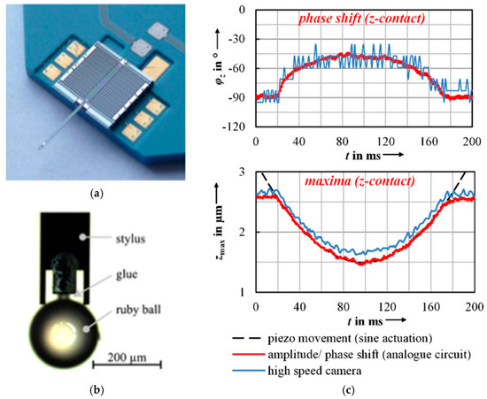 Figure 11 shows the development of a microprobe that vibrates the probe tip using a MEMS electrostatic actuator [118]. It was possible to vibrate the probe tip in three directions [100], because it was composed of compact actuators, thus allowing the microprobe system to be smaller than a few centimeters [100]. A ruby ball with a diameter of 200 μm was used as the probe stylus and glued to the end of a shaft. The length of the shaft is approximately 4 mm; therefore, the aspect ratio is approximately 20. The probe tip is larger than that of other vibration probes. The resonant frequency toward the vibration axis is 730 Hz, and the stiffness is of the order of 10 N/m. The probe was vibrated with an amplitude of 4.7 μm at the resonant frequency; moreover, its probe response was measured. The amplitude decayed and phase changed as the probe moved closer to the measurement surface. The driving force to the probe tip was higher than that of the damping forces; thus, there was no signal change before the contact, indicating that the probe signal change is attributed to physical contact and frictions. An additional study demonstrated that the vibration damping behavior can be attributed to the viscoelasticity close to the measurement surface material [119].