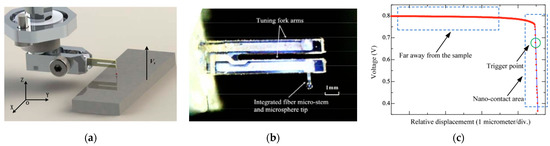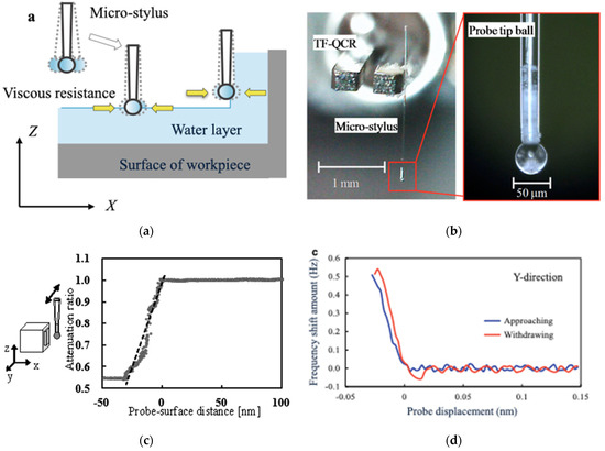 Generally, there is a thin liquid layer on the surface of an object [120]; the fluidic viscosity in this liquid layer differs from that in free space. Share force microscopy uses the amplitude damping of the oscillated sharp-edged sensing probe caused by the viscosity change to detect the surface [121]. This principle was used in the micro-CMM probe [48,115,122,123,124] (Figure 12). A probe stylus was developed by gluing a glass microsphere to the tip of a sharpened glass pipette. The probe tip size is 10–50 μm, and the shaft length is approximately 2.5 mm, thus resulting in an aspect ratio of >50. The stylus is bonded to the tuning folk to provide a unidirectional signal in a horizontal direction. The stylus is brought closer to the measurement surface; therefore, the share force dampens the probe’s vibration (Figure 12c). Due to the share force and van der Waals (VDW) force, the resonance frequency will be shifted (Figure 12d) [123]. Positioning stage control is important because the gap between the probe tip and surface is only a few tens of nanometers when the probe signal changes. This principle using the share force detection can achieve a remarkably high resolution.
