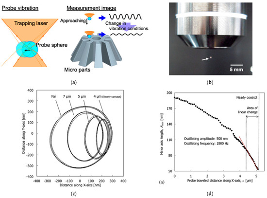A probe stylus is commonly composed of a probe shaft and tip. Laser-trapping-based probes use a technique of optical tweezers to capture the probe tip [68,125,126,127] (Figure 14). The probe tip is trapped in air using optical tweezers (Figure 14b). A glass sphere with a diameter of 5–8 μm is used as a probe tip. Thus, the probe tip size can be considerably smaller compared with other microprobe systems. An objective lens with a large focusing angle (high numerical aperture) must capture the glass sphere. Therefore, the glass sphere escapes from the focused laser beam or is unstable when the laser beam is partially blocked by the measurement object. Thus, laser-trapping-based probes are not suitable for deep hole measurements. The virtual shaft length is approximately 30 μm, and the aspect ratio is <4 [126]. The force to trap a probe tip is in the order of nanonewtons; therefore, the stiffness is as low as 0.15 mN/m, which is significantly small. The trapped probe tip oscillates at the resonance frequency of 2.7 kHz with an amplitude of a few 100 nm: the probe tip’s response amplitude decay or phase change is used to sense the surface. By measuring the change in the rotational orbit (Figure 14c), the position and direction of the measurement surface can be simultaneously detected. The probe tip can easily stick to the surface when it comes into contact with the measurement surface; therefore, the surface position is detected by setting a threshold value for the vibration damping before making contact with the measurement surface. The response probe amplitude begins to decay at approximately 10 μm before the surface. The probe tip is oscillated using beam deflection and can vibrate the probe tip in 3D by Brownian motion [128]. The probe stiffness is significantly low; therefore, the probe tip can sense the electric field distribution in the field. Therefore, the scanning measurement can be realized by measuring the standing wave field close to the surface [129]. Furthermore, to observe the micro-texture of the surface, the laser-trapped glass sphere can be used as a lens [130]. Thus, the laser-trapping-based probe can perform different measurement modes in one microprobe system.