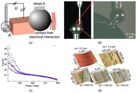 Tunneling current probe developed by University Erlangen-Nuremberg: (a) conceptual image of probe, reprinted with permission from ref. [135]. Copyright 2008 Elsevier, License Number: 5158841052985; (b) photograph of probing [136]; (c) probing signal [134]; (d) measured result [134].