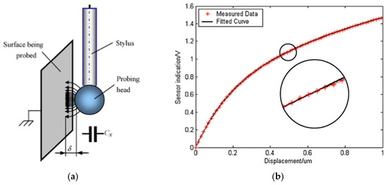 A sensing principle based on the electrical energy was used in the same manner as the tunnel current, and a capacitive sensor was applied to the surface detection principle [137]. When the probe tip was brought close to the surface, the change in capacitance between the probe tip and measurement surface was measured for detection (Figure 17a). The tunnel current had a high lateral resolution, whereas the capacitive sensor had a low lateral resolution because of the extended electric field; however, extremely high axial sensitivity could be expected. Furthermore, the sensor had 3D isotropic detection and was not affected by adhesion forces because it did not make contact with the measurement surface. For the prototype, the probe tip diameter was as large as approximately 3 mm, and the shaft was 100 mm with an aspect ratio of 33. When the probe was brought close to the measurement surface, the response signal changed from a few micrometers. Figure 17b shows the representative probing data. The sensing resolution exceeded 4 nm, and there was concern that the measurement characteristics changed depending on the surface material and texture. Furthermore, the measurable materials were limited.