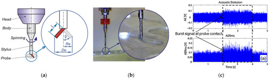 As previously reported, even a small contact force can damage the measurement surface at the microscale. Therefore, most probe systems minimize measurement forces or avoid contact. Acoustic emission (AE) is a signal generated during contact and is often used for contact detection and process condition monitoring in mechanical machining [138]. A microprobe system that uses AE has been proposed [139,140]. Moreover, a wire with a sharp edge was rotated at high speed to induce AE signals. Figure 18a,b shows the schematic and image of the probe tip. The excited AE signals were collected by an AE sensor attached closely to the measured object. The wire was composed of stainless-steel and coated with polytetrafluoroethylene (PTFE). The radius of rotation of the wire was considered as the effective probe tip diameter, which varied depending on the rotational speed; for rotations of 10,000–80,000 rpm; the effective diameter was 720–730 μm. The shaft length was several millimeters, and the sensing repeatability of ~0.86 μm has been used for 90 measurements. Figure 18c shows that the AE signal can be obtained during probe contact. Contact excites the AE signal; therefore, probe tip wear, and measurement surface damage are important. The probe tip wears a few micrometers between measurements; however, the damage to the measurement surface could not be identified via SEM observations.