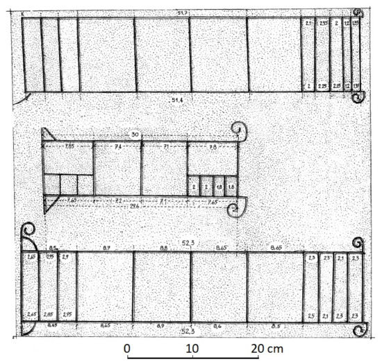 The first surprise concerned the length of the Doric foot. The archaeologist who identified this relief measured the length of this rod as 322 mm [6], which was much shorter than the assumed length of the Doric foot, which was 327 mm. However, a more recent study indicated that the edges of the curving are not normal to the slab surface but inclined, so that 322 mm is measured at the bottom of the curving and 327.5 mm at its perimeter on the slab surface. This was indeed the first direct evidence of a Doric foot [1], previously inferred only from the dimensions of a few elaborate monuments [1,4].