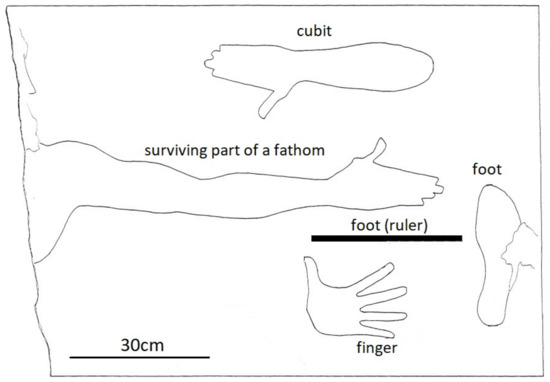 This is a sculpted marble slab, known as the “Salamis metrological relief” found in the 1980s in Salamis, an island very close to Athens, more widely known due to a famous naval battle in antiquity, during the invasion of Persians to ancient Greece. The surviving part of this relief shows part of a man standing erect with hands extended horizontally to indicate a fathom, prints of a cubit and of a foot, as well as an open fist to indicate fingers to represent the subdivision of a foot. The extraordinary point in this relief is that, apart from anthropomorphic length units, it also includes the length of a measuring rod (Figure 2; [6]). This finding, however, was not without surprises.