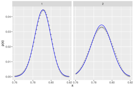 Prior distributions for prevalence of COVID-19 under two sets of assumptions that are described in Section 2.2.2. Each panel shows the exact prior (+symbols) calculated by numerical integration and the beta distribution (blue line) fitted by minimizing KL divergence. The range of prevalence, , has been shortened to bring out the differences while still including the central 95% interval.
