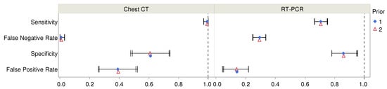 Estimated values of diagnostic accuracy parameters and their 95% posterior intervals are shown for chest CT and RT-PCR for two choices of Bayesian priors. For numerical values, see Table 2.