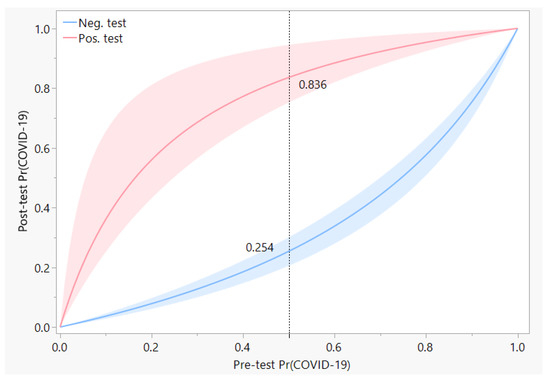Post-test predictive values of the RT-PCR test are shown as a function of the pre-test expectation, which can also be considered to be the prevalence of COVID-19 in the local community. Red and blue curves represent the probability of COVID-19 after a positive or negative test result, respectively, with the width of each band indicative of the 95% posterior interval of the probability. The dotted reference line shows an example of the change in probability from 0.5 pre-test to a post-test value of 0.836 if the RT-PCR test was positive, or to 0.254 if the RT-PCR test was negative.