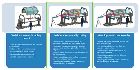 8] describes the assembly methods and their limitations based on the use of fixed and rigid toolings, and how external metrology solutions based on photogrammetry and laser technologies can be used to solve the lack of flexibility of these assembly methods. Mei et al. present a review of flexible and measurement-assisted assembly technologies in aircraft manufacturing, in which they suggest a digital metrology system as the basis for accurate digital flexible assembly [