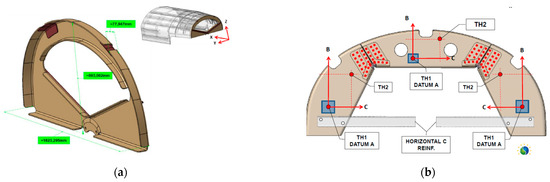 The overall dimensions of the ARE prototype are approximately 3 m × 2.2 m × 1.2 m. In all cases, except for the skin, the local reference system is defined by some specific Tooling Holes (THs) realized as measuring points. The datum plane is defined by 3 points (TH1, TH2 and TH3), the secondary axis is defined by TH1 and TH2, and the coordinate system’s origin is defined by TH1. In the case of the composite skin, the reference system shall be defined with the origin (TH1), the main axis (TH1 to TH2) and 6 additional TH lugs (TH3/TH4/TH5/TH6/TH7/TH8) along the longitudinal edges that shall be used to get the best-fit position (see