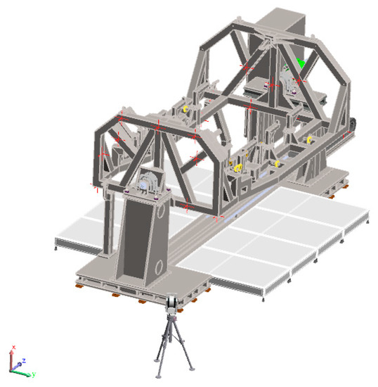 The number of target points and their distribution are identified aided by the main tooling CAD. Aiming to obtain a measurement uncertainty that is as low as possible, target points are volumetrically distributed along the XYZ dimensions of the jig structure. At this point, the target points are defined for both the main tooling (fixed points) and the moving stage that brings and locates the load frames.