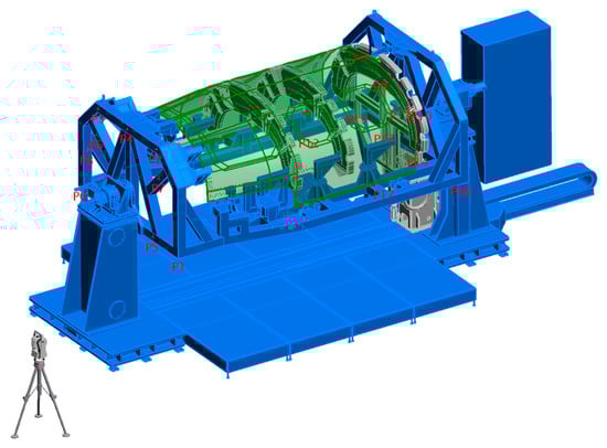 Figure 20. The obtained layout enables measuring multiple target points located in the tooling such as the fixed points (FPs), the mobile points (MPs) and the parking points (PPs). It shall be highlighted that a coincident location of the LT with the turning axis has been considered during the simulation, but the obtained results show that the visibility of several target points is considerably reduced. Concerning the location of the batch of target points, 20 points are volumetrically distributed as a result of the simulation. A total of 17 out of 20 points are attached to the main structure and the remaining 3 points are fixed to the mobile carriage.