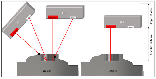 The probing system is an LLS, depicted in Figure 2. The LLS is a probing system that generates the measured points by making use of triangulation. This probe generates data by projecting a plane of laser light onto the object’s surface and the intersection thereof is determined by capturing the reflected laser light. The non-contact character of an optical measurement system, like an LLS, allows for a high measuring speed and a high-density sampling point generation compared with the conventional tactile probing systems [13,14,15]. On the other hand, the precision can be an order of magnitude worse than a tactile system. As a consequence, the reachability of the surface forms a constraint for the use of the LLS. Additionally, the LLS needs to respect a minimal distance to the object, i.e., the scan depth. This minimal distance is referred to as standoff distance. Furthermore, only the surface within the field of view, defined by the width of view and the depth of view, can be scanned. Lastly, the angle between the laser beam and the normal on the surface must be smaller than the maximum angle of reflectance. This maximal angle of reflectance is not only dependent on the surface characteristics, but also on the laser settings, i.e., laser intensity and exposure time. Since this study assumes uniform surface characteristics and constant laser settings, the maximum angle of reflectance is constant for the algorithm. This value is dependent on the surface characteristics, sensor settings and ambient conditions. Figure 3 illustrates the constraints of the LLS.