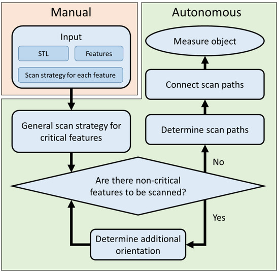 Future work could consist of creating a manner to integrate the possible scan strategies of specified features in the STL model, similar to how a PMI-file integrates non-geometric attributes of an object with a three-dimensional (3D) model. This will make the system in accordance with the principles of Industry 4.0. Furthermore, the algorithm could be improved by integrating better path finding algorithms to avoid a collision and find a shorter path between different scan tracks. The proposed algorithm does not yet generate the absolute optimal scan paths in terms of scan time minimization. Scan path adaptions can be integrated on the fly in order to lower the uncertainty interval when 100% conformance cannot be given; this situation is illustrated Figure 12.
