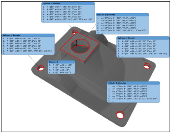 The first step in the process is the manual input of all data required beforehand. Three separate files can be defined. Firstly, a Standard Triangle Language (STL) of the object and its position in the CMM space is required. Secondly, all critical features need to be defined. The critical features are the features with a different tolerance for the general geometrical tolerance of the object. Thirdly, a file containing the scan strategies for each individual critical feature needs to be established as an input. Each scan strategy for a critical feature is able to confirm the task-specific tolerances. All these strategies are determined preliminarily by making use of a digital twin [20]. Figure 5 depicts an object where the STL file and the different scan strategies for all critical features are combined. In this example, the object has six features with a tolerance differing for the general tolerance: five cylinder diameters and one distance between two planes. It can be seen in the figure that the diameter of cylinder 1 can be scanned by joint multiple predetermined combinations; for example a scan strategy with following joint combinations: A = 15° and B = −180°, −90°, 0° and 90°. Joint A and B operate as depicted in Figure 2.