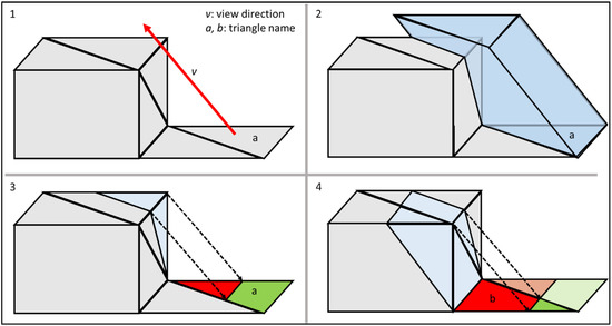 In order to determine the reachability of a surface, the ech individual triangle of the STL, which complies to the maximum angle constraint, is verified. The working principle to verify the reachability is depicted in Figure 6 and works as follows: (1) the first triangle is selected; in this case triangle a. (2) This triangle forms the base of the view space in the direction of the view direction. (3) Every part of the object within the established view space is determined. These parts are projected according to the view direction on triangle a. In Figure 6(3), the red part is blocked for the LLS by the object and the green part is reachable. (4) This process is repeated for every triangle until the reachability is determined for the specified view direction. The total coverable area for the projected laser light are represented in green. Afterwards, this process is performed to verify the cover limited by the reflected laser light.