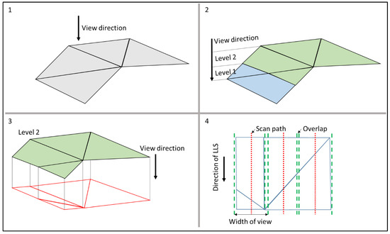 For each view direction, the corresponding scan paths are determined. This process is illustrated in Figure 7. Firstly, all of the surfaces, which are covered for a specific view direction, are selected. Secondly, these surfaces are divided in depth levels. The LLS has a depth of view and not all areas can be covered with the same scan depth. Therefore, the first depth level starts at the minimum height for the view direction. The second depth level starts one depth of view higher than the first depth level. This is repeated until the maximum height is reached. Thirdly, each depth level is projected along the view direction on a plane. Lastly, the scan paths are established on this projection. The direction of the scan paths corresponds to the direction of the LLS for the specific view direction, i.e., the direction from the sensor of the LLS to the laser source. Each covered area of a scan path has some overlap with the following scan path to avoid under-scanning.