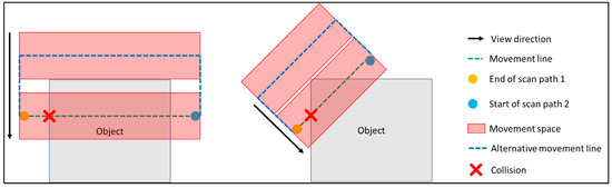 In case of an interference of the movement space and the object, the movement line is adapted. Since the CMM repositions the LLS in a straight line, the movement line is also a straight line of the combinations of multiple straight lines. When a collision is detected, the movement line is shifted contrary to the view direction. The movement line translates so the movement space surpasses the maximum of the object in perspective of the view direction. This situation is illustrated in Figure 9.