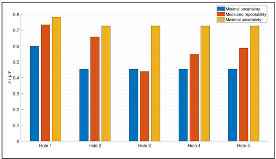 The objects have the specified tolerances as discussed in Step 1 and illustrated in Figure 5. The specific tolerances for each feature are listed in Table 1. The diameter of five inner cylinders and the distance between two planes need to be determined. Different scan strategies are evaluated with the digital twin. The correctness of the uncertainty determination is evaluated by comparing the estimated uncertainty with the measured repeatability of the cylindrical critical features. The measured repeatability is an estimate of the measurement uncertainty. However, the measurements are performed on one specific measurement device, the MC16 Coord3 16.10.8 and the Nikon Metrology N.V LC60Dx LLS. As a consequence, the uncertainty due to the geometric kinematical errors of the CMM, assumed by the digital twin, are not present in the measured repeatability. Therefore, two types of uncertainty are calculated: the minimal uncertainty, i.e., the uncertainty of the aph and the LLS, and the maximal uncertainty, thus including the kinematical errors of the CMM. The measured repeatability should be between those two values for validation. The repeatability is determined for the diameter of five inner cylinders with 10 measurements for each hole. Hole 1 is the large inner cylinder with a reference diameter of 40.043 ± 0.001 mm, as determined on the CMM using a tactile probe. The diameters of the small holes 2–5 have a reference nominal diameter of 15 mm; the reference diameters are listed in Table 1. Each hole is measured on four sides with an angle of 45°. Figure 11 depicts the comparison of the five holes. For all holes, the measured repeatability is within the values of the minimum and maximum virtually estimated uncertainty. The measured repeatability is larger than the minimum uncertainty due to the fact that some error contributors are not included in the digital twin. For example, the hysteresis of the CMM is present in the repeatability tests, but is not included in the digital twin. Furthermore, the limited number of experiments have an influence on the determined repeatability, i.e., the variation of the repeatability of holes 2–5.
