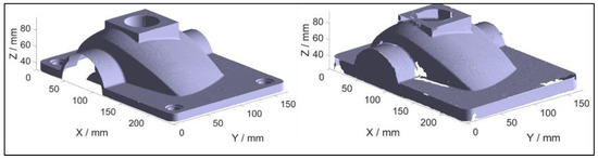 Figure 14 depicts an STL (for visibility) of the point cloud measured by the generated scan path for each orientation of the matte object. The measurements taken in these four orientations merged together are able to cover the entire surface. Figure 15 shows the generated point cloud of the matte surface on the left. Figure 15 also shows the experimentally generated data of the reflective object on the right. For this object, the orientations for the evaluation of the features were not sufficient to cover the entire surface and additional orientations are required. It can be noted from Figure 15 that the density of the point cloud is lower due the reflective character of the object. From Figure 15, it can be concluded that both objects are maximally scanned, thus the algorithm generates a correct scan path.