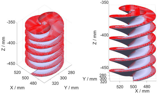 The objects depicted in Figure 10 have low complexity in terms of reachability of the surface. In order to prove the algorithm’s capacity to deal with more complex geometries, an Archimedean screw is virtually measured. The screw is depicted in Figure 16. The maximum angle of reflectance is supposed to be 40°, making it difficult to reach the inner parts of the screw. Figure 16 depicts the measured point cloud obtained through the algorithm. As can be seen in the picture, the inner screw cannot be scanned due the blockage by the upper parts in combination with a small maximal angle of reflectance. Furthermore, the algorithm was able to predict these unmeasurable areas and did not create additional scan paths to measure these areas.