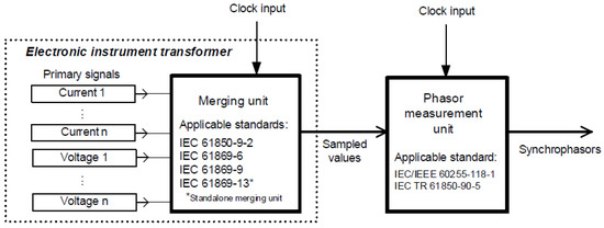 Such a distributed measurement infrastructure can be realized by interconnecting different devices in different locations. A complete refurbishment of each grid substation is practically unfeasible and therefore one of the first challenges to solve is represented by the interoperability, i.e., the capability of interconnecting instruments from different manufacturers and with different specifications [13]. In this sense, the IEC 61850 [14] constitutes the framework for the development of a fully digital and inter-operable substation, where the different Intelligent Electronic Devices (IED) communicate with each other using the same protocols and data formats [15,16,17]. In particular, the IEC 61850-9-2 introduces the Sampled Value (SV) protocol for the transmission of the secondary output of Non-Conventional Instrument Transformer (NCIT) [18]. In the typical measurement setup, a Stand Alone Merging Unit converts the analog output of the NCIT into a digital stream of SV and publishes them on the substation network. In this way, the SV are available not only for storage and post-processing applications in the control room, but also for an on-line estimation process as performed by IEDs [16], PMUs [19,20] or Power Quality Instruments (PQIs) [21,22]. The recent literature has proposed several approaches for calibration of NCIT [23,24] or related instrumentation [25]. Furthermore, the synchronization aspects have been addressed [26], but not so much attention has been given to the possible repercussions on real power systems’ operations.