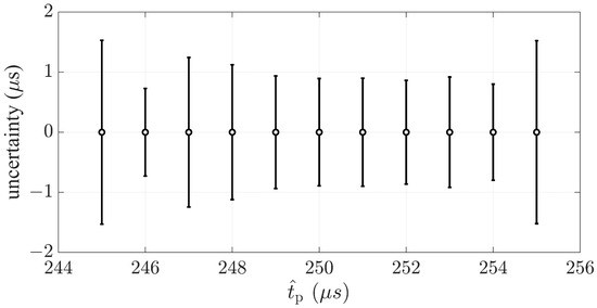 Figure 2 shows the symmetric uncertainties affecting the time periods elapsing between the SV packets as measured by the SV-PMU. Each of these uncertainties corresponds to two standard deviations determined from the values, computed by taking the difference between time-stamped SV packets, normally distributed around the corresponding nominal publishing period . For this uncertainty evaluation, eleven nominal publishing periods have been chosen within the interval ranging between 245 and 255 s, whose limits represent a 5 s deviation from 250 s, which corresponds to a common publishing period adopted by many commercial SAMUs.