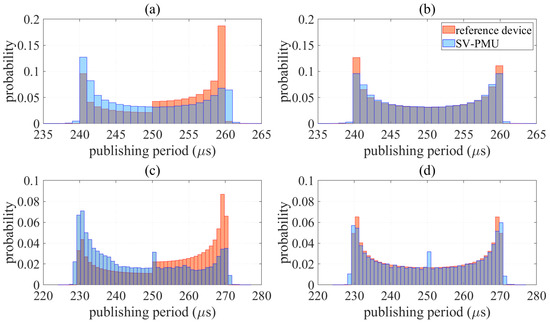 Figure 3 compares the distributions of 120,000 publishing periods measured between packets sent by the reference SAMU and packets received by the SV-PMU. The time periods between the published SV deviate from the nominal publishing period of 250 s according to a sinusoidal function. Four characterization measurements has been performed with sinusoidal deviations realized by combining two different amplitudes and frequencies. A comparison of the histograms suggests that the SV-PMU appears to be more affected by the increase in frequency than the increase in amplitude of the publishing rate variation. The SV-PMU distributions shown in Figure 3b,d in fact, reproduce better the distributions calculated with the values of the reference SAMU than in the case shown in Figure 3a,c.